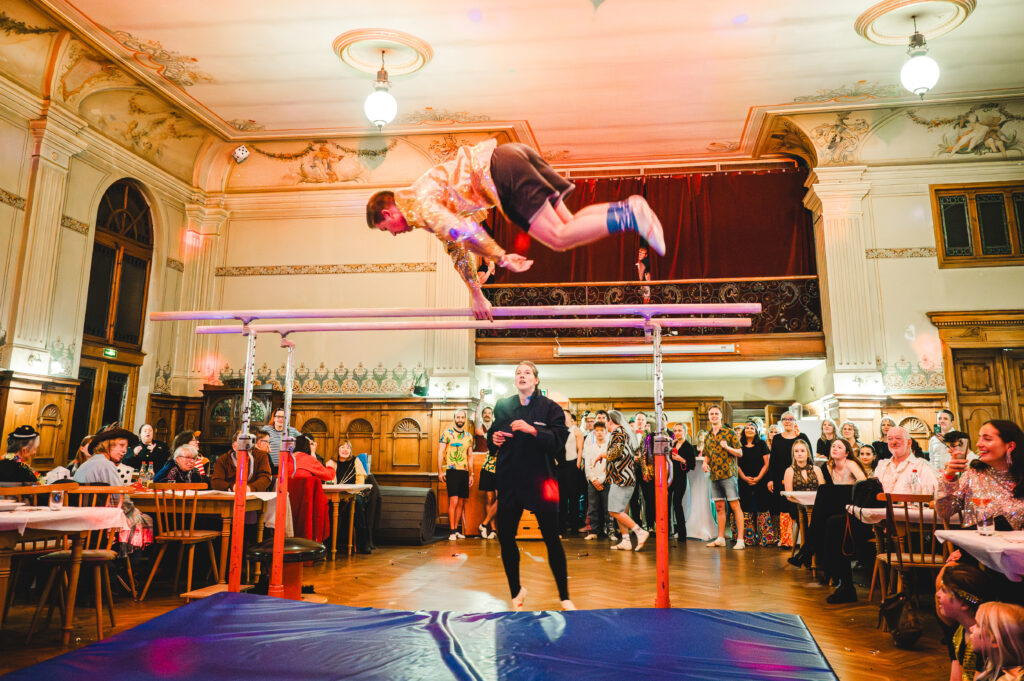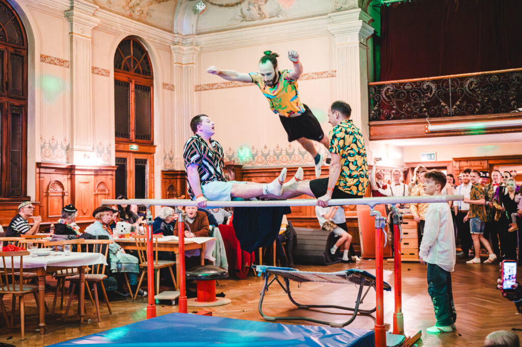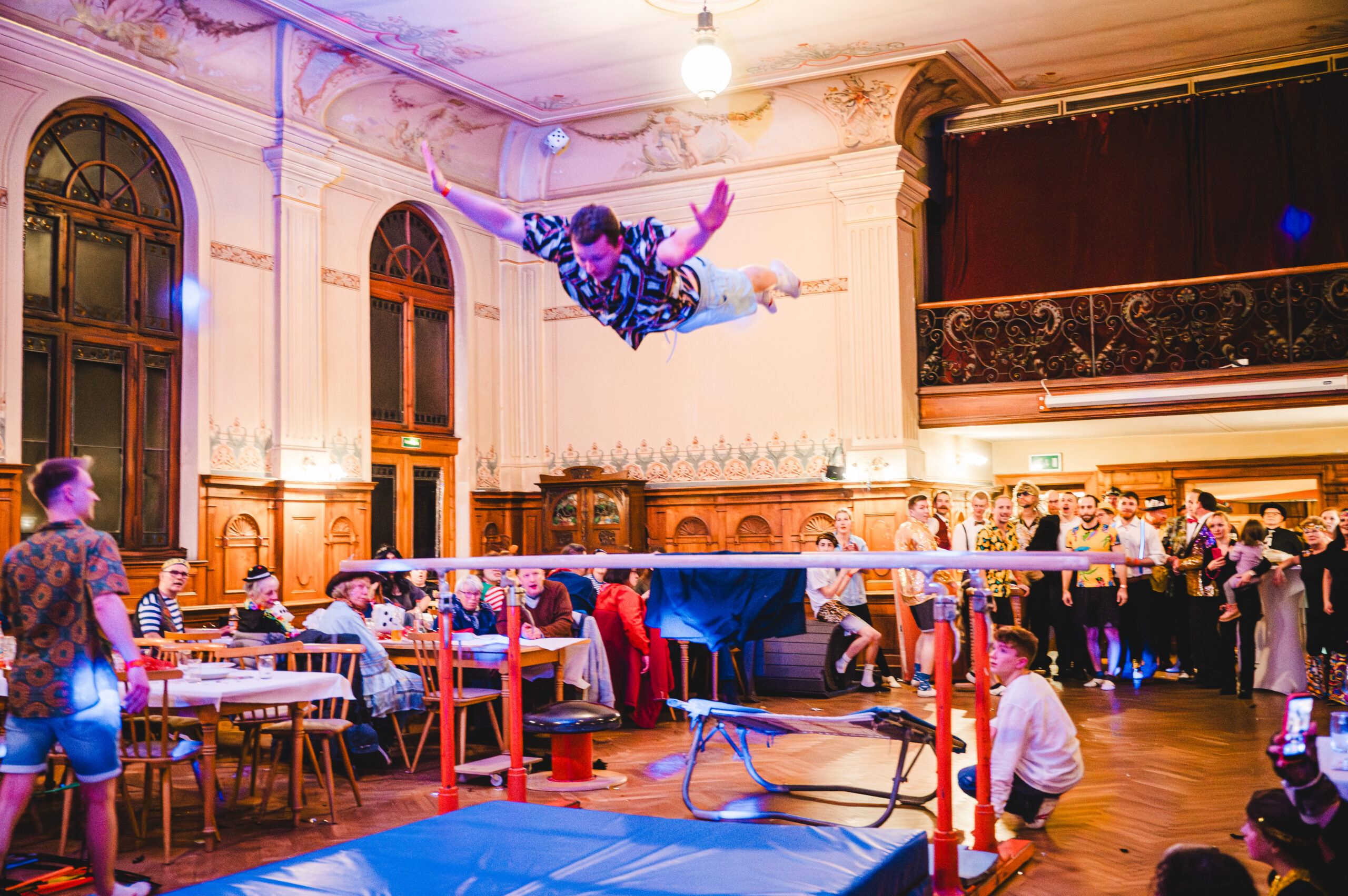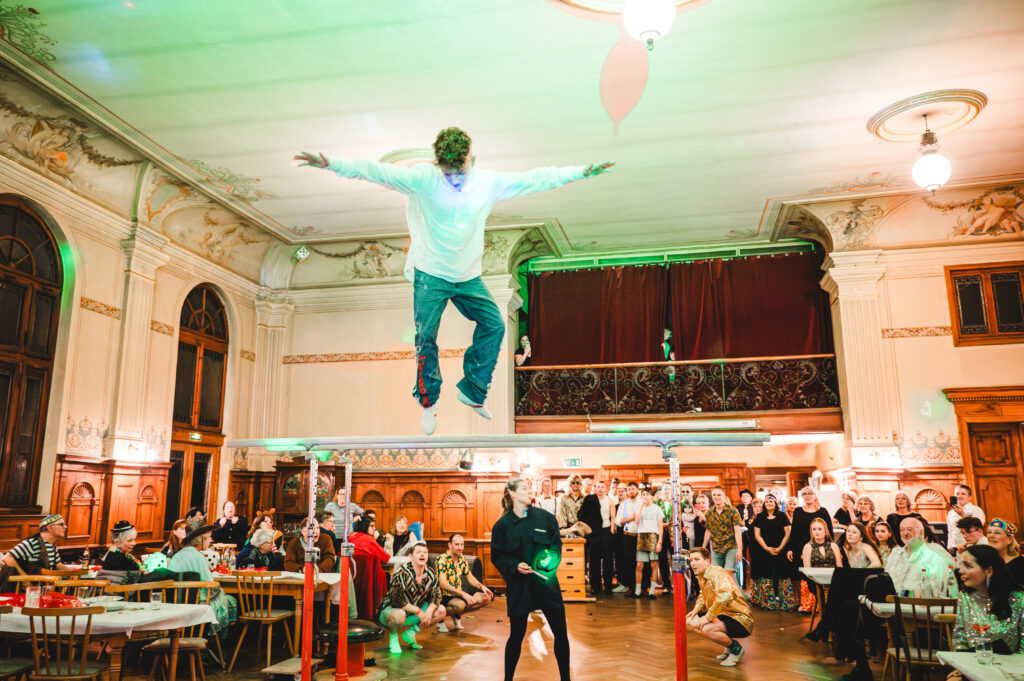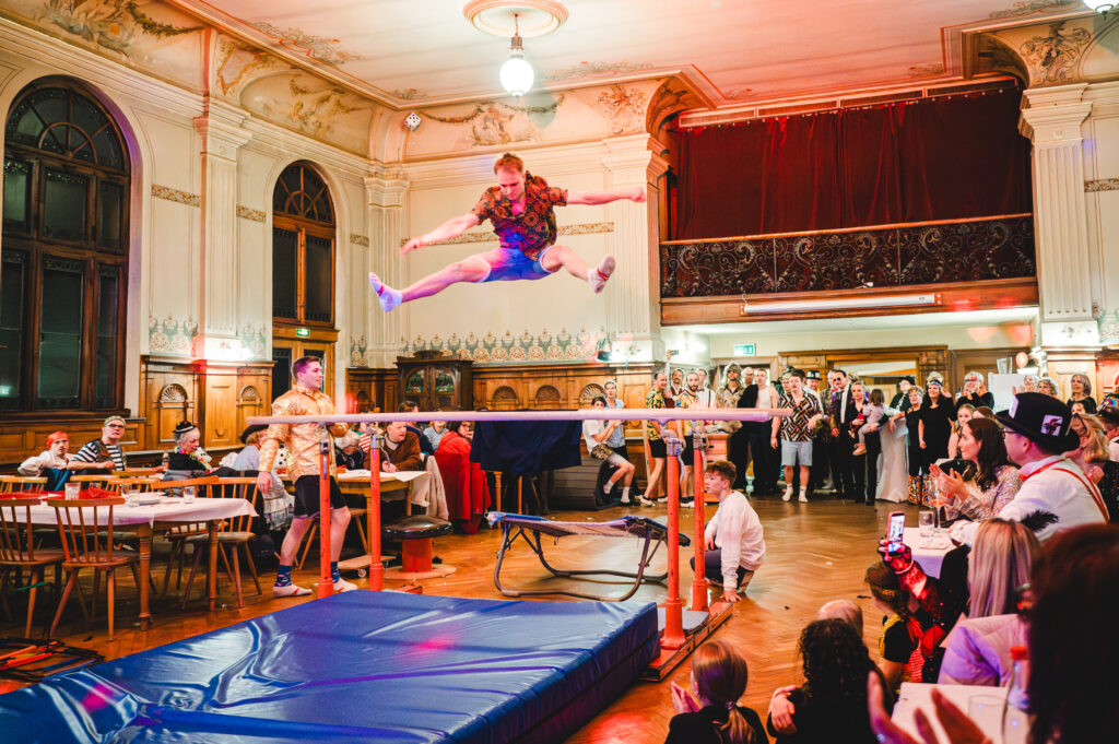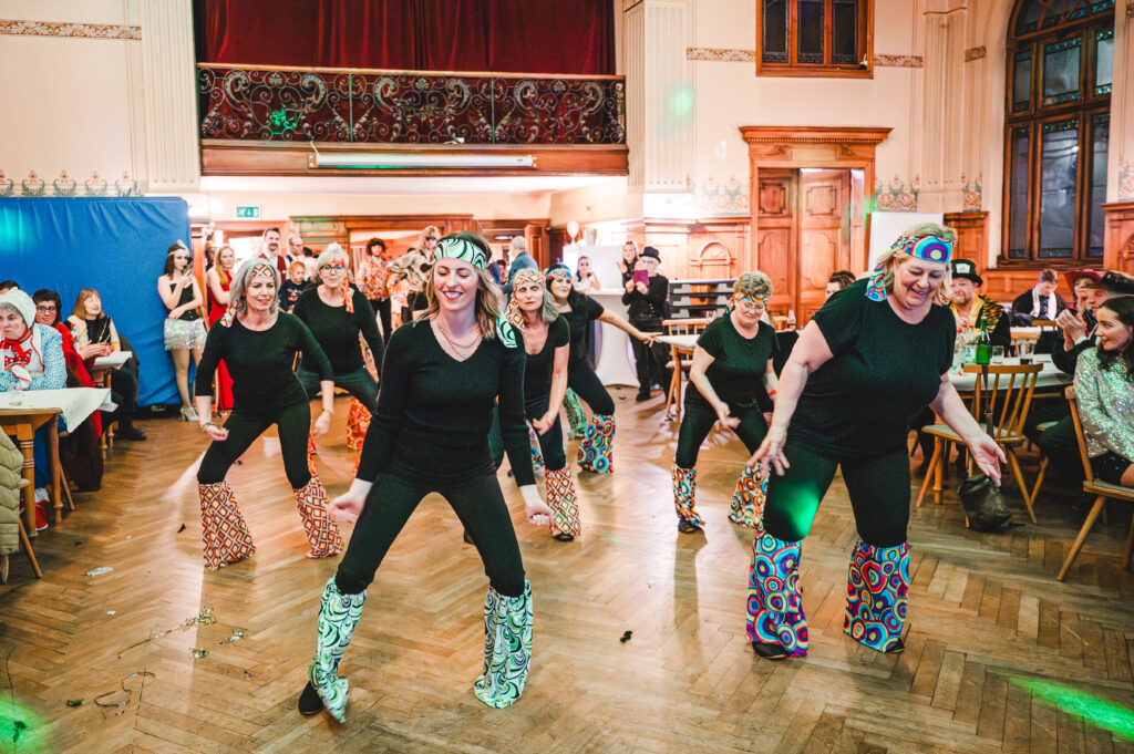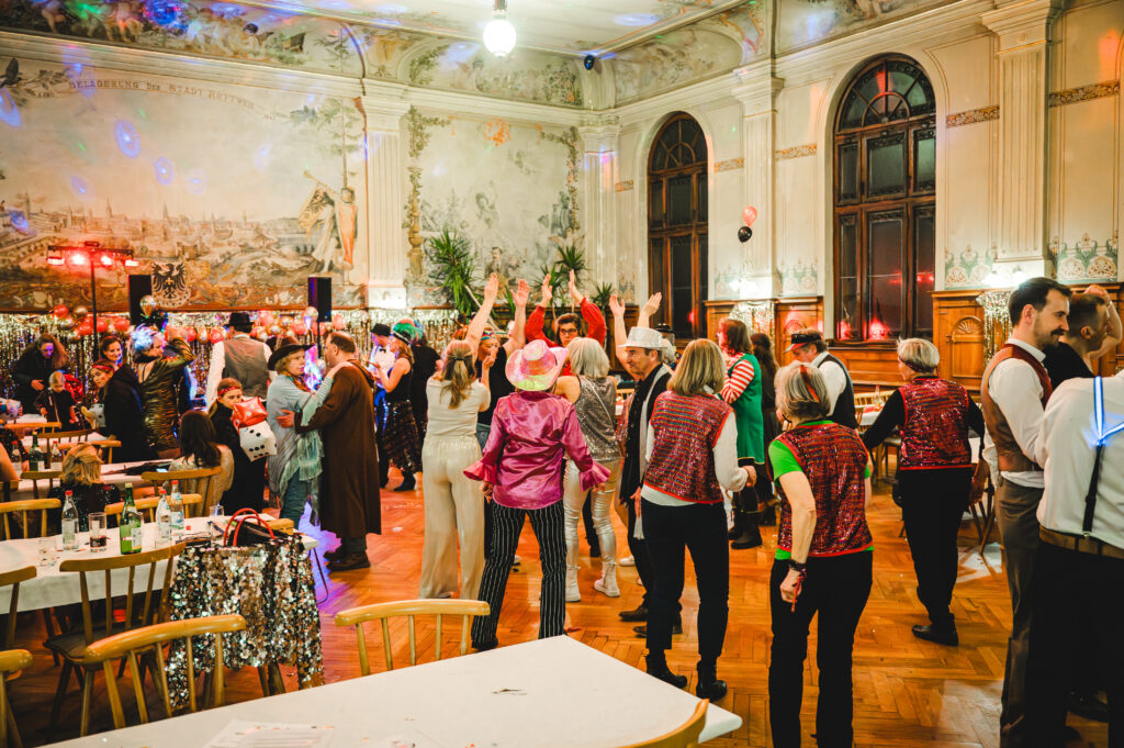 Showtime am 31.01.2026 im wunderschönen Pflugsaal mit viel Glamour einer stimmungsvollen Deko, motivierten Gruppen und staunenden Gästen. Der Turnerball des TV Rottweil war für alle Beteiligten ein rundum gelungener Abend. Zu Beginn machten Ann-Kathrin Rieble und Moritz Zürn bei ihrer Begrüßung dem Publikum klar, dass es genau wie in Las Vegas Höchstleistungen und spektakuläre Darbietungen erwarten kann. Mit dem traditionellen Einzug der Reichstadtweiber wurde schon beim ersten Narrenmarsch die Tanzfläche von vielen Kindern und den Besuchern der Lebenshilfe eingeweiht. Die Turngruppen von Cordula Merkt und Lisa Rauschenberger zeigten vollen Einsatz auf den Steppern und die Freizeitkicker unter der Leitung von Robin Auch sorgten mit ihrem Videobeitrag und den Quizfragen für eifriges Mitraten im ganzen Saal. Bei einem gereimten Jahresrückblick mit einer Diashow der etwas anderen Art ließen Gabi Rauschenberger und Bettina Auch die Vereins-Ereignisse der vergangen Monate noch mal Revue passieren. Lena Pizzitola hat auch in diesem Jahr mit ihrer JS-Crew eine energiegeladene Choreografie einstudiert und die Turnerinnen von Lena Schaarschmidt wirbelten akrobatisch über Turnmatte und Kasten. Beim Tanz der Purzelbaummädels von Vroni Schmid mussten dieses Jahr am Ende das Publikum mit auf die Tanzfläche und auch die grandiose Musikauswahl von DJ Nördie Gördie sorgte für so manche schwungvolle Runde auf dem Parkett. Der spektakuläre Abschluss des Programms gehörte wie in jedem Jahr den Turnern. Passend zum Thema mussten sich Gabriel Zimmerer, Marius Mink, Kevin Morawetz, Moritz Zürn und Markus Helzer nach einer durchzechten Nacht mit Handstand, Salti, Schwüngen und Rollen am Barren vor einer engagierten Polizistin retten, ein echtes Hang Over nach einem heißen Abend im Rottweiler „Las Vegas“.